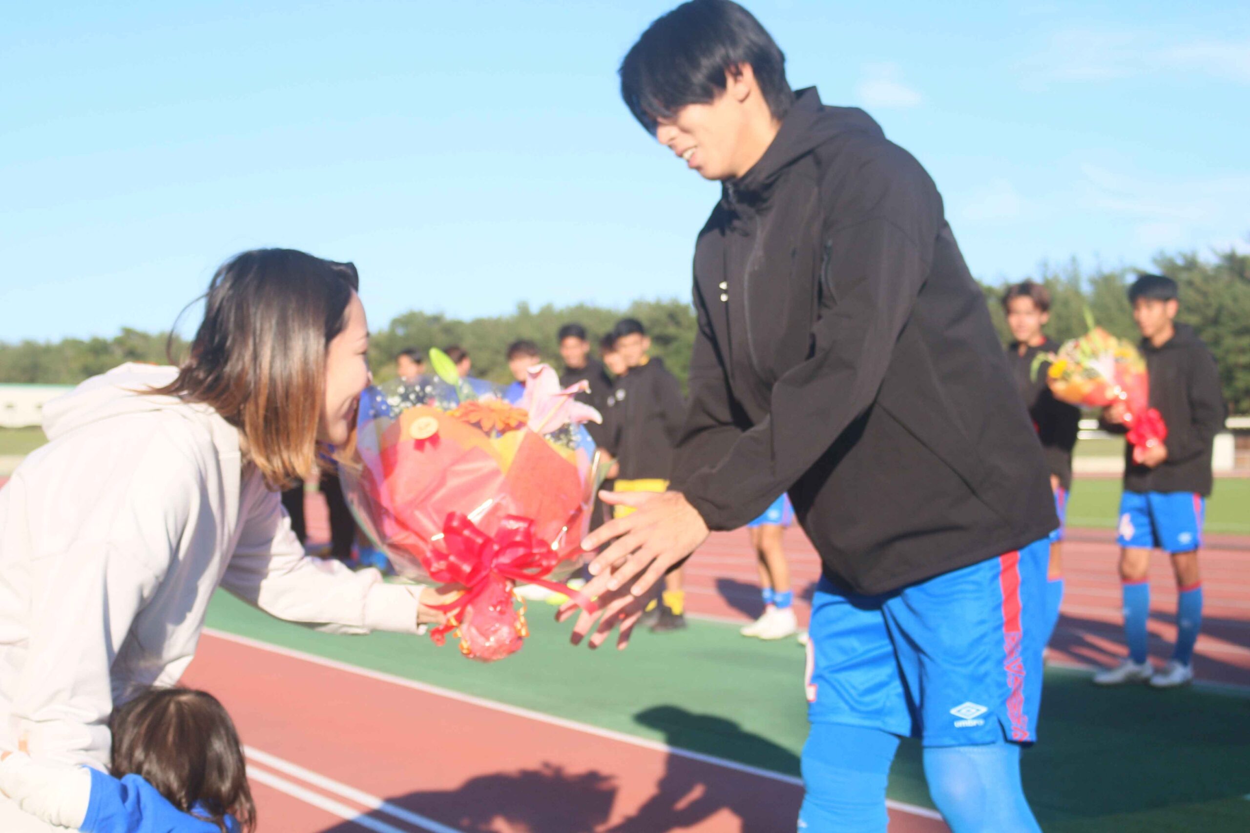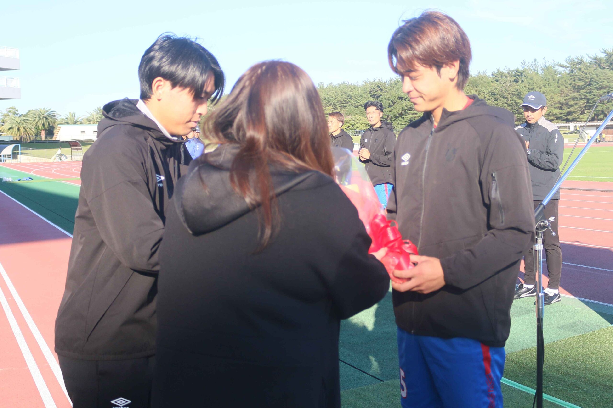 11月24日(日)ホーム最終節の試合終了後にセレモニーを実施し、中荒井部長、宮路監督、五十嵐主将、